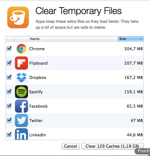 I file temporanei della cache sono dei file invisibili che permettono un caricamento più veloce delle app e del loro contenuto: solitamente Spotify ha dei pesantissimi file temporanei (tutta la musica che ascolti abitualmente precaricata), i browser come Chrome e Safari (tutto il contenuto dei siti che hai visitato), Flipboard, Facebook e via dicendo. Eliminare questi file non comporta nessun rischio o perdita di informazioni e rimarrai stupita dalla quantità di spazio che potrai liberare. Nel mio caso, ho liberato 1,19 GB in un solo gesto: