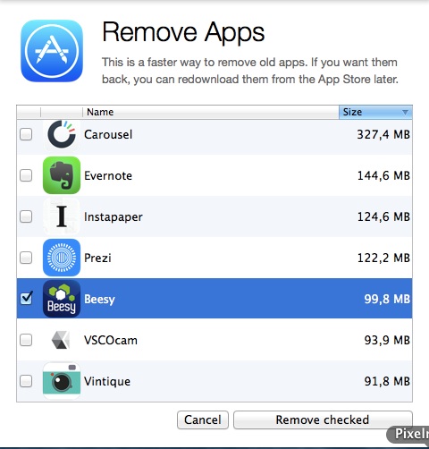 5. Adesso tocca disinstallare le app che usi meno, clicca sul pulsante blu Remove Apps. Questa operazione può essere fatta anche sull’iPad stesso, senza bisogno di PhoneExpander, l’unica differenza è che sull’iPad le applicazioni si disinstallano una per una, con PhoneExpander ti basta spuntare in blocco tutte le applicazioni inutili e poi cliccare sul pulsante Remove checked per vederle sparire tutte insieme. Disinstalla senza timore anche le app a pagamento che non usi per il momento: se in futuro dovessi averne ancora bisogno potrai scaricarle gratuitamente. Io elimino solo Beesy (è finita l’epoca delle riunioni per me, almeno per il momento…) per questa volta, che occupa circa 100 MB: