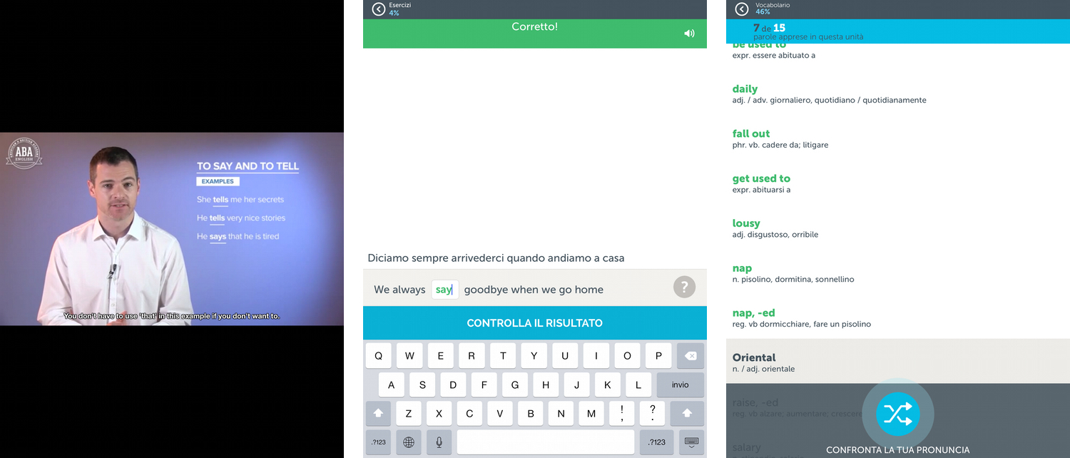 ABA English: le sezioni Videolezioni, Esercizi e Vocabolario