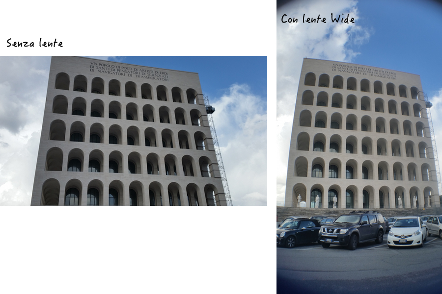 Foto di un edificio scattata con Samsung Galaxy S5 e poi con lo stesso smartphone e una lente grandangolare aggiuntiva